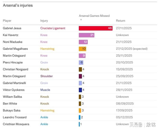 12月13日消息,本赛季阿森纳25人一线队阵容里,先后17名球员受伤,受伤的人数仅仅比利兹联少,排第二。